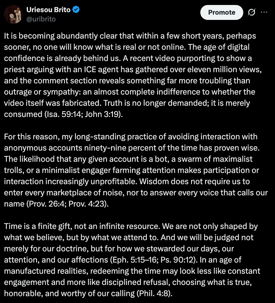 For this reason, I remain unconvinced that the loudest Christian voices online are the most faithful, or even the most effective. Attention is a poor substitute for authority, and virality is no mark of virtue. The work of God has always advanced through ordinary means—prayer, patience, obedience, and presence—long before it ever needed a platform. And it will continue to do so long after the adrenaline fades and the edges lose their appeal.